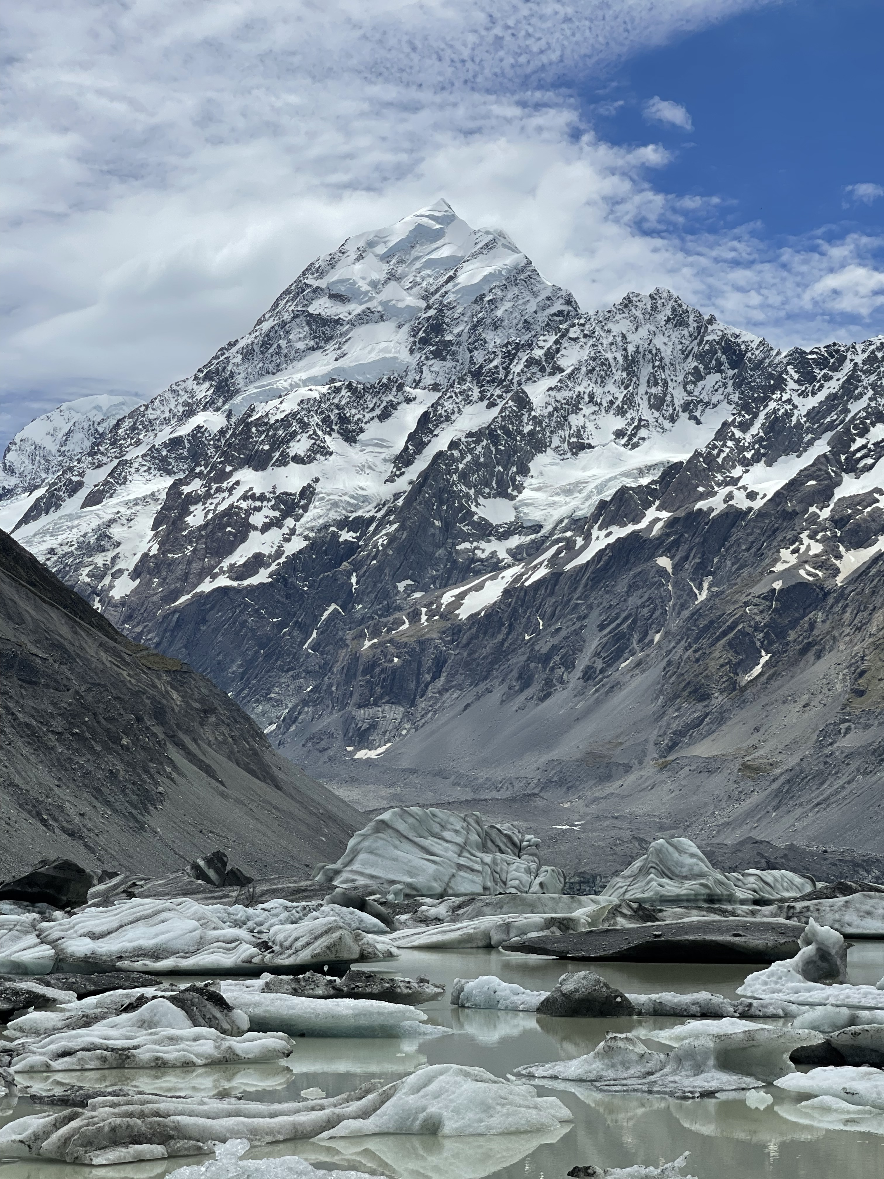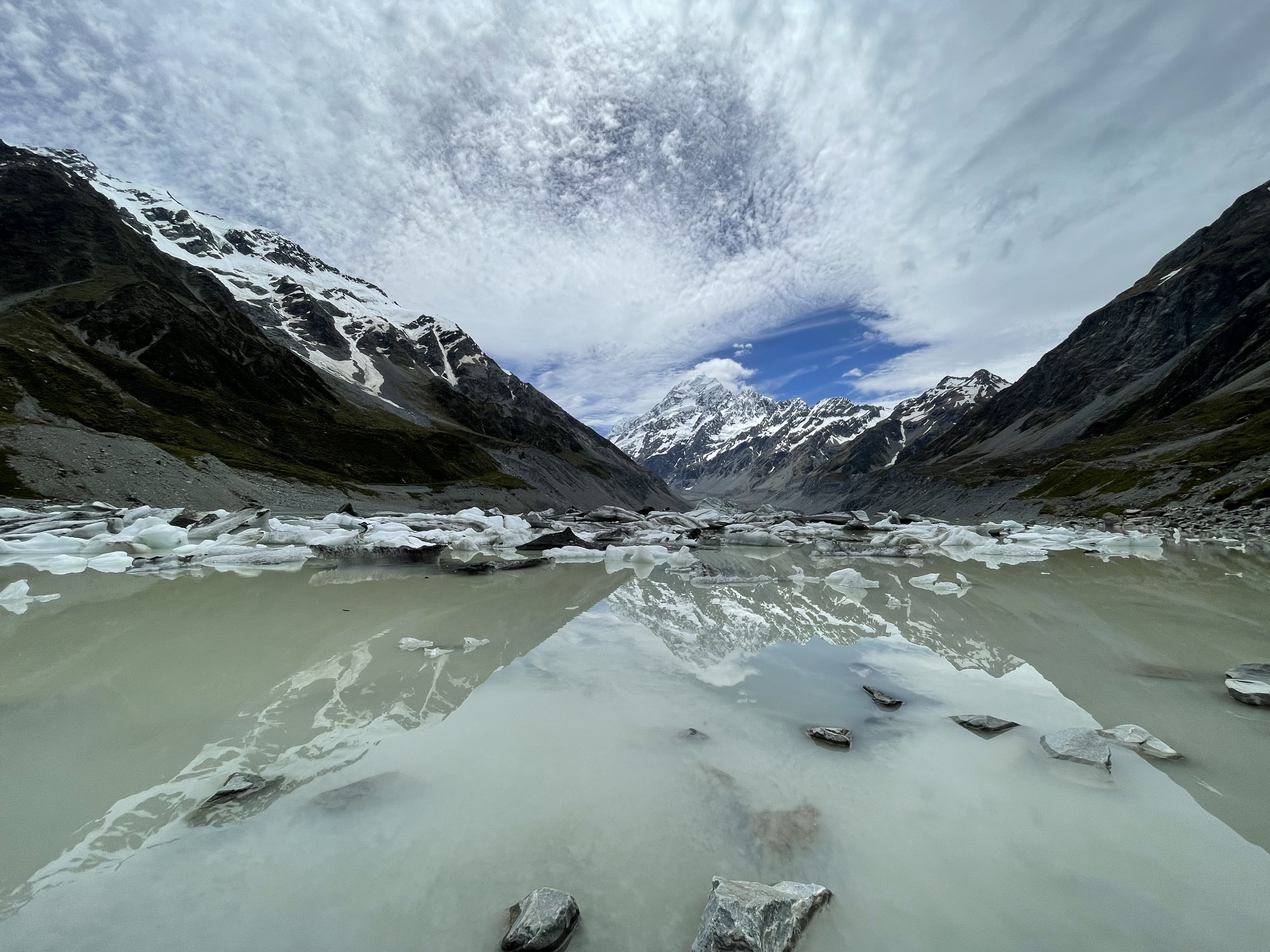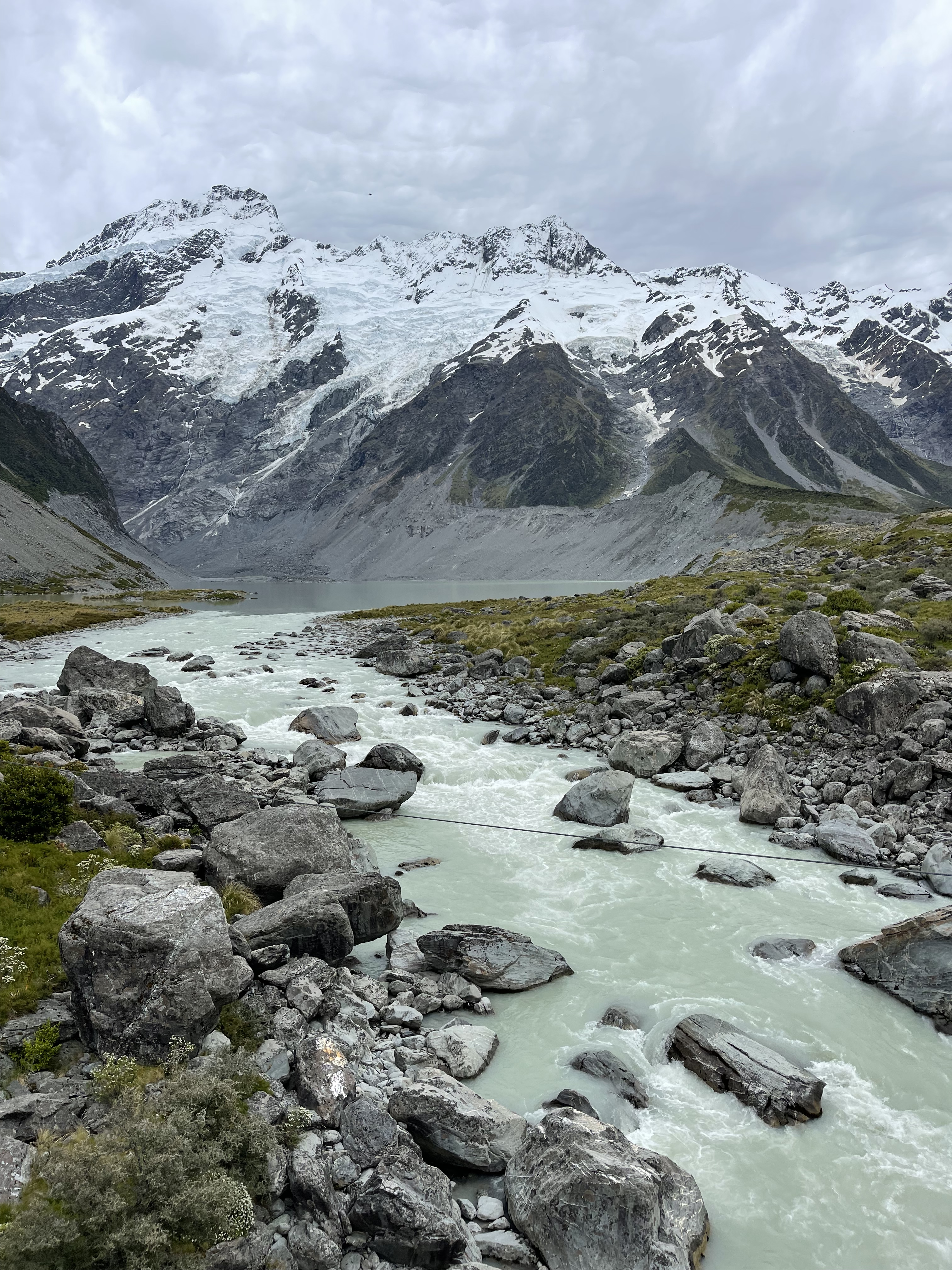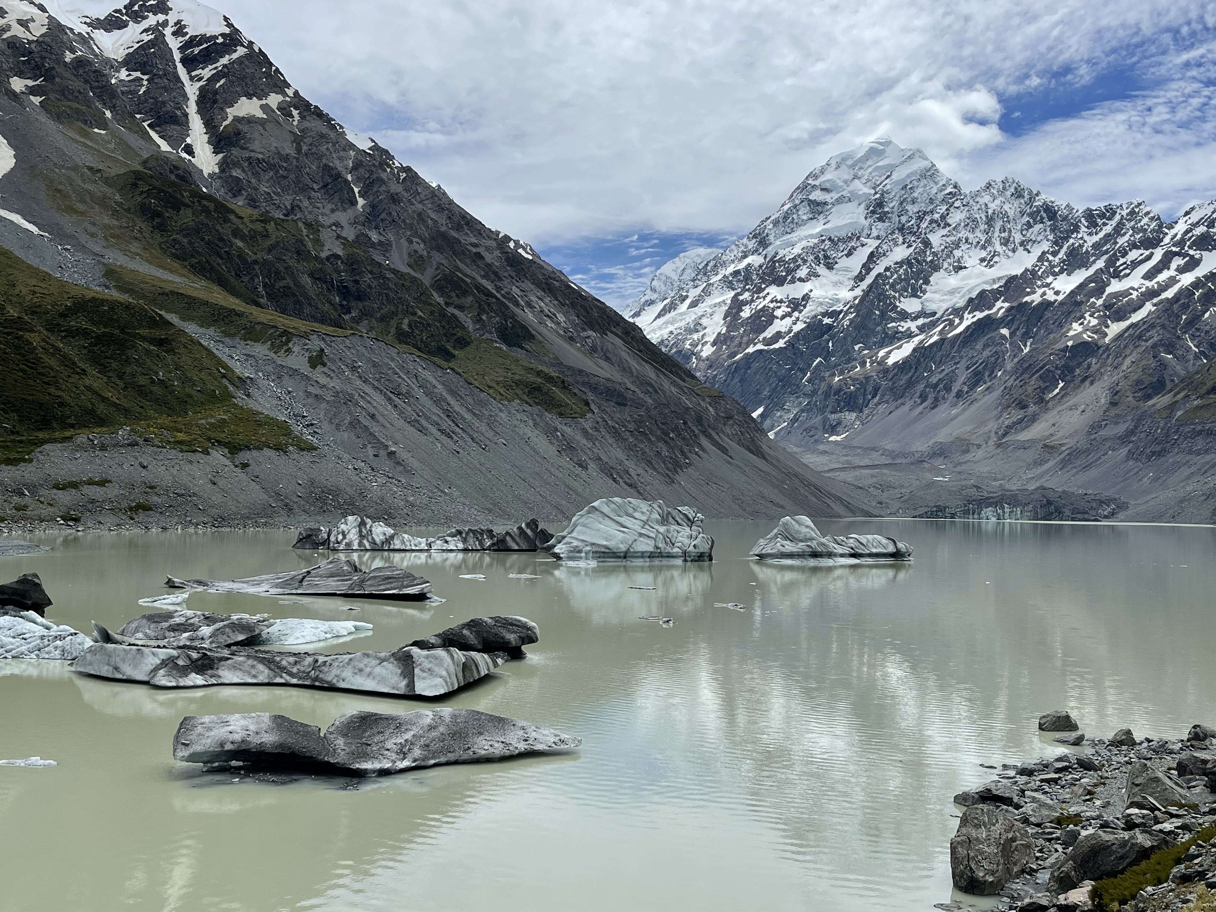 On a choisi une marche de 10km et 3 Hr, la Hooker valley track. On y restera bien 5 heures en flânant, déjeunant et mitraillant tellement l’endroit et le track sont photogéniques. Trois passerelles suspendues nous amènent à près de 900 mètres devant un petit lac au pied d’un glacier. Et dans ce lac à l’eau à 3 degrés, des icebergs qui se sont détachés du glacier et fondent lentement avant d’être emporté par le gros torrent qui descend vers la vallée. C’est tout simplement magnifique et on une chance énorme avec le temps. Le ciel est bleu, moments magiques.