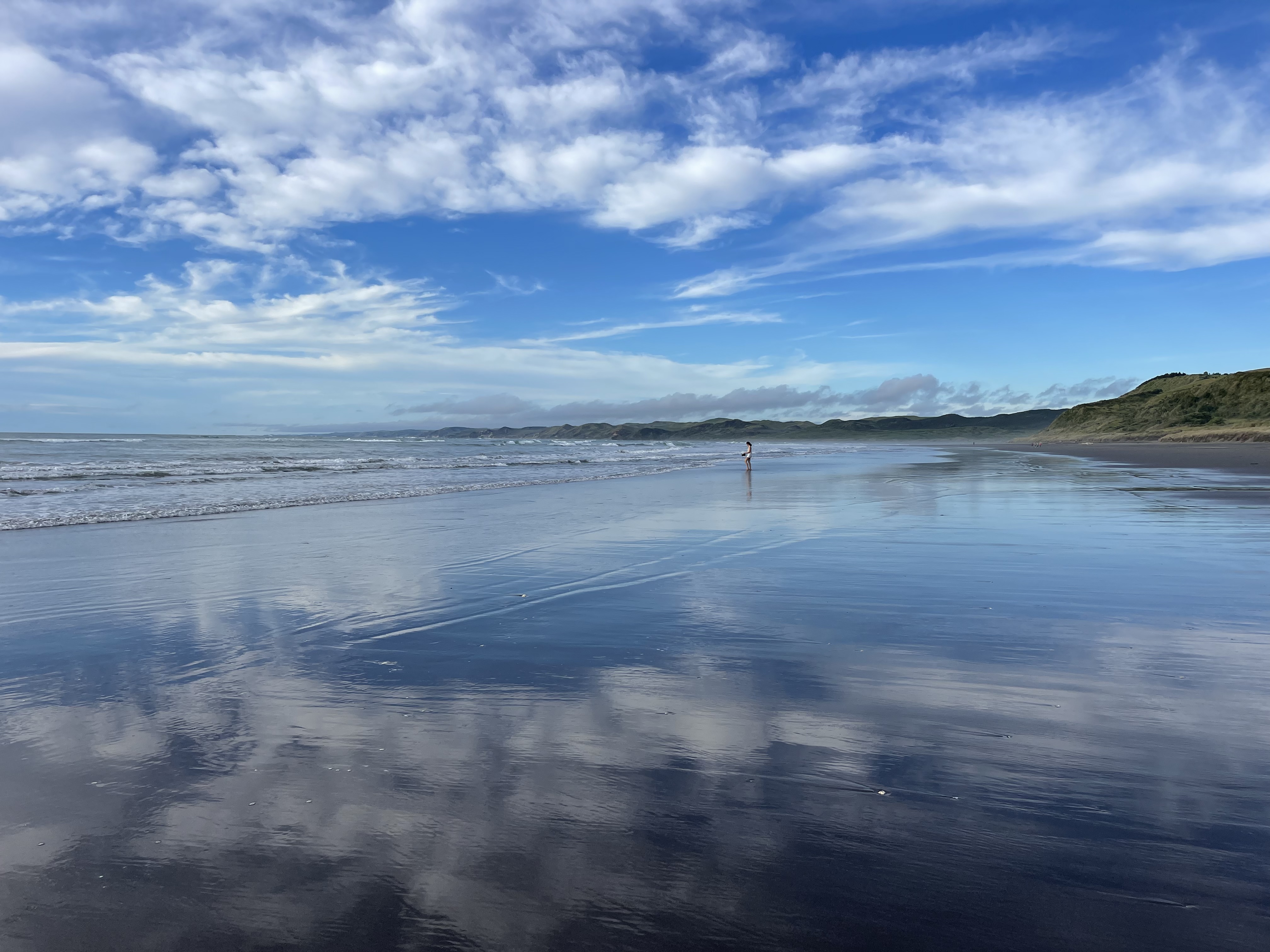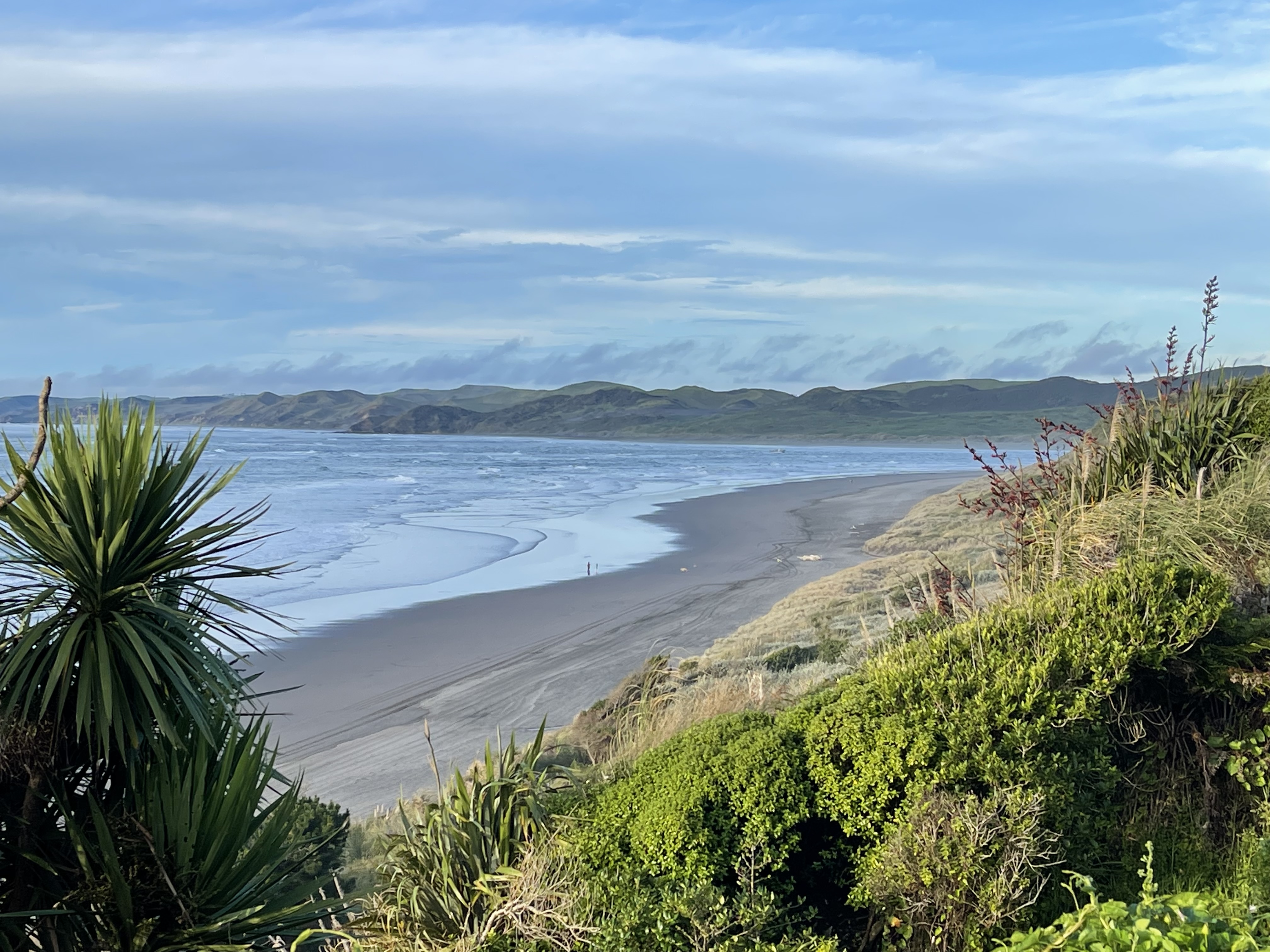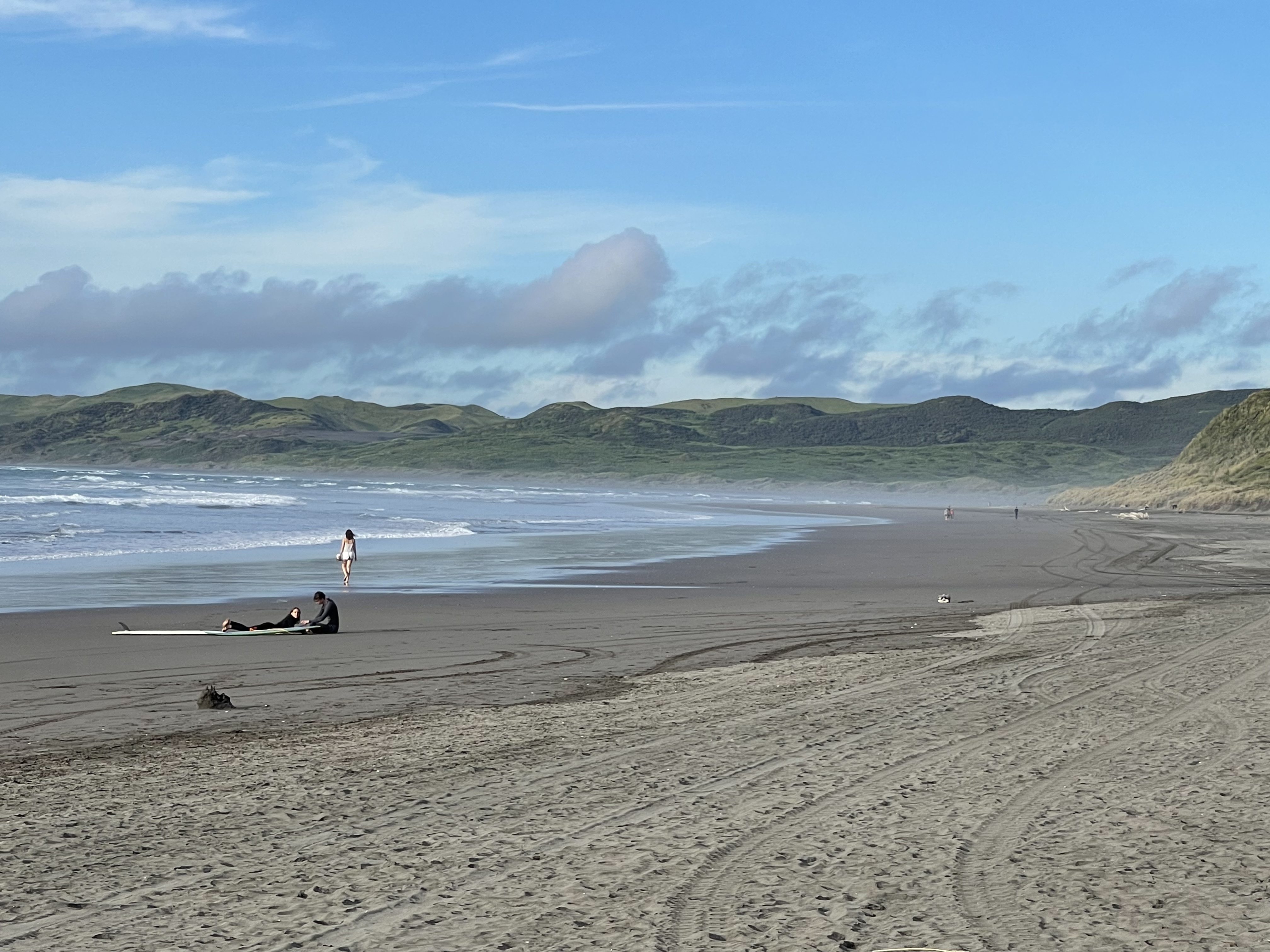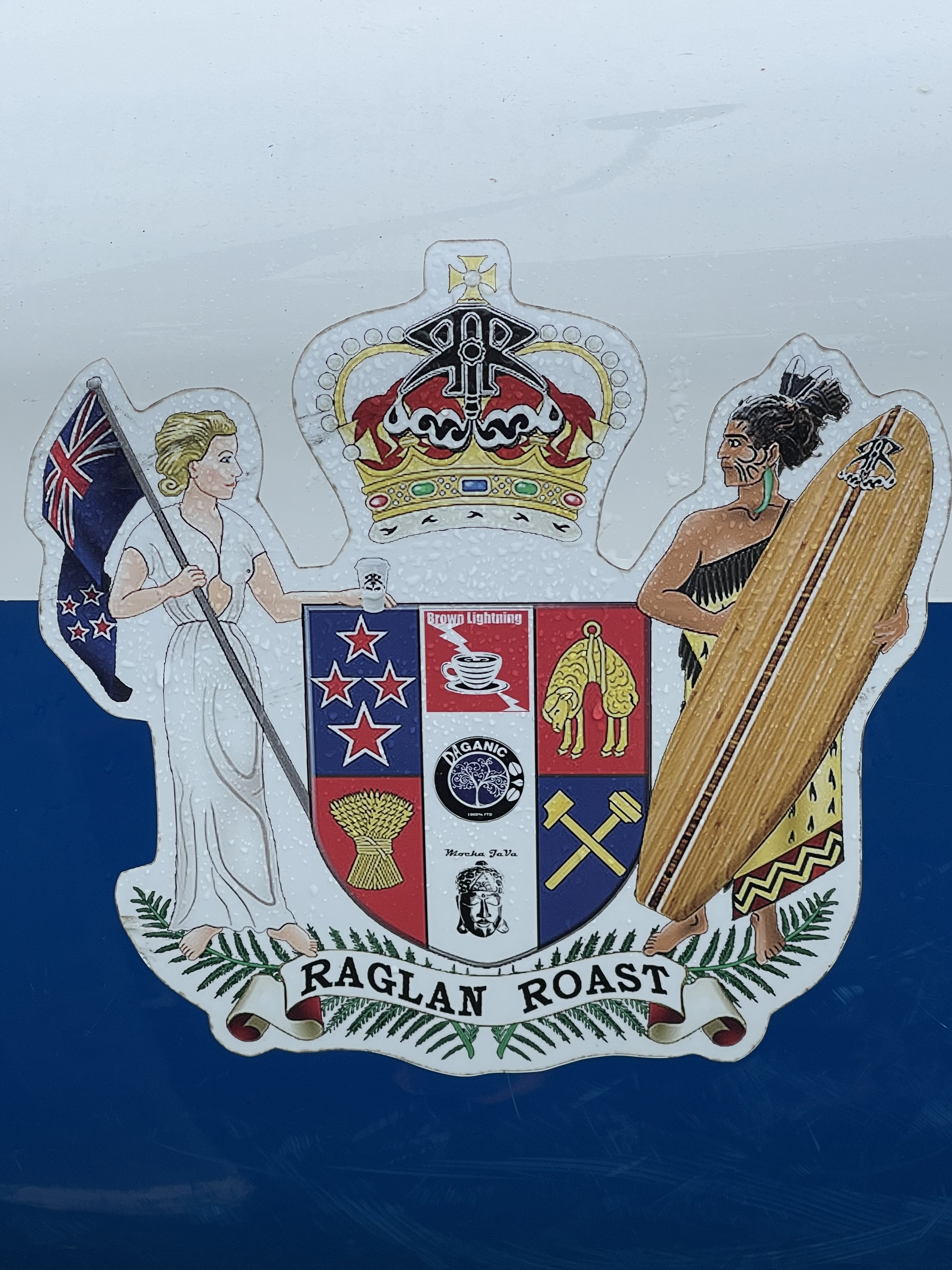Après une longue journée de voyage (3 bonnes heures de route vers Christchurch, un avion vers Auckland puis encore 2 bonne heures de route), nous découvrons notre dernière étape: Raglan. Petite station balnéaire de 4000 habitants (sa population est multipliée par 5 en été), très mignonne, à 50 km à l’ouest d’Hamilton sur la cote ouest dans le district de Waikato. Paradis des surfeurs, la ville s’étend autour de bras de mer et d’une très grande baie. Des plages de galets et de sables s’égrènent au fil du littoral. Ce seront la baie des Baleines, la baie de Manu et surtout la magnifique plage de Ngarunui. Plage de sable de plus 3km de long, à pente très douce. Superbe. On y fait une longue promenade et j’y reviens le lendemain pour un jogging matinal. Un vrai régal.